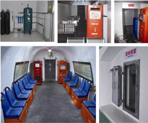 避難硐室設(shè)置在式煤礦井下適當(dāng)位置,配備有維持人員生存所需的相關(guān)設(shè)備設(shè)施和食物、水等,為保證煤礦災(zāi)害發(fā)生時(shí),給無(wú)法撤離災(zāi)區(qū)的遇險(xiǎn)人員提供生命保障的空間。避難硐室與礦井安全監(jiān)測(cè)監(jiān)控、人員定位、壓風(fēng)自救、供水施救、通信聯(lián)絡(luò)等系統(tǒng)相連,形成井下整體性的安全避難系統(tǒng),主要由防爆密閉系統(tǒng)、氧氣供給系統(tǒng)、通訊及人員定位系統(tǒng)、監(jiān)測(cè)監(jiān)控系統(tǒng)、環(huán)境控制系統(tǒng)、照明系統(tǒng)、生存保障系統(tǒng)組成。